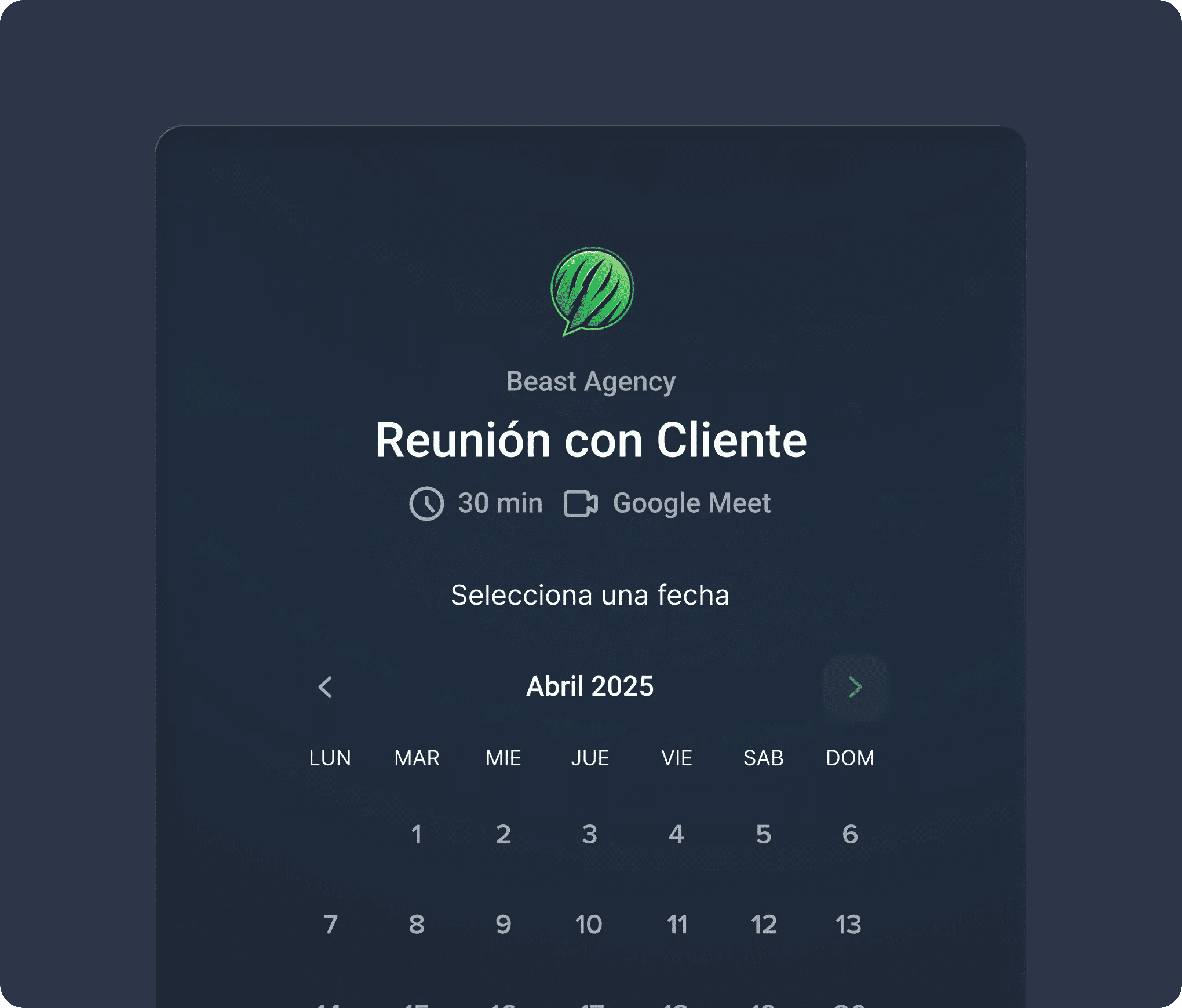 Permití que tus clientes reserven una reunión directo desde tu web. El sistema agenda, notifica y crea el enlace automáticamente, convirtiendo tu landing en un embudo de ventas listo para cerrar oportunidades.